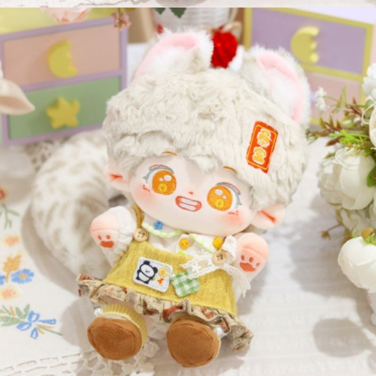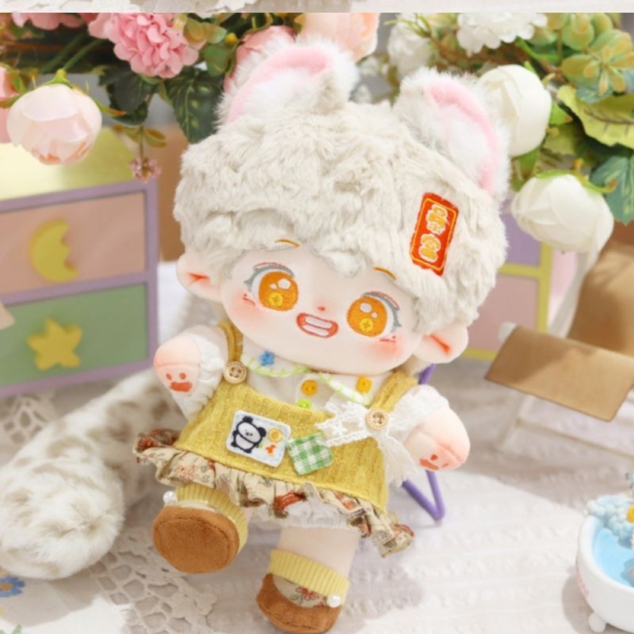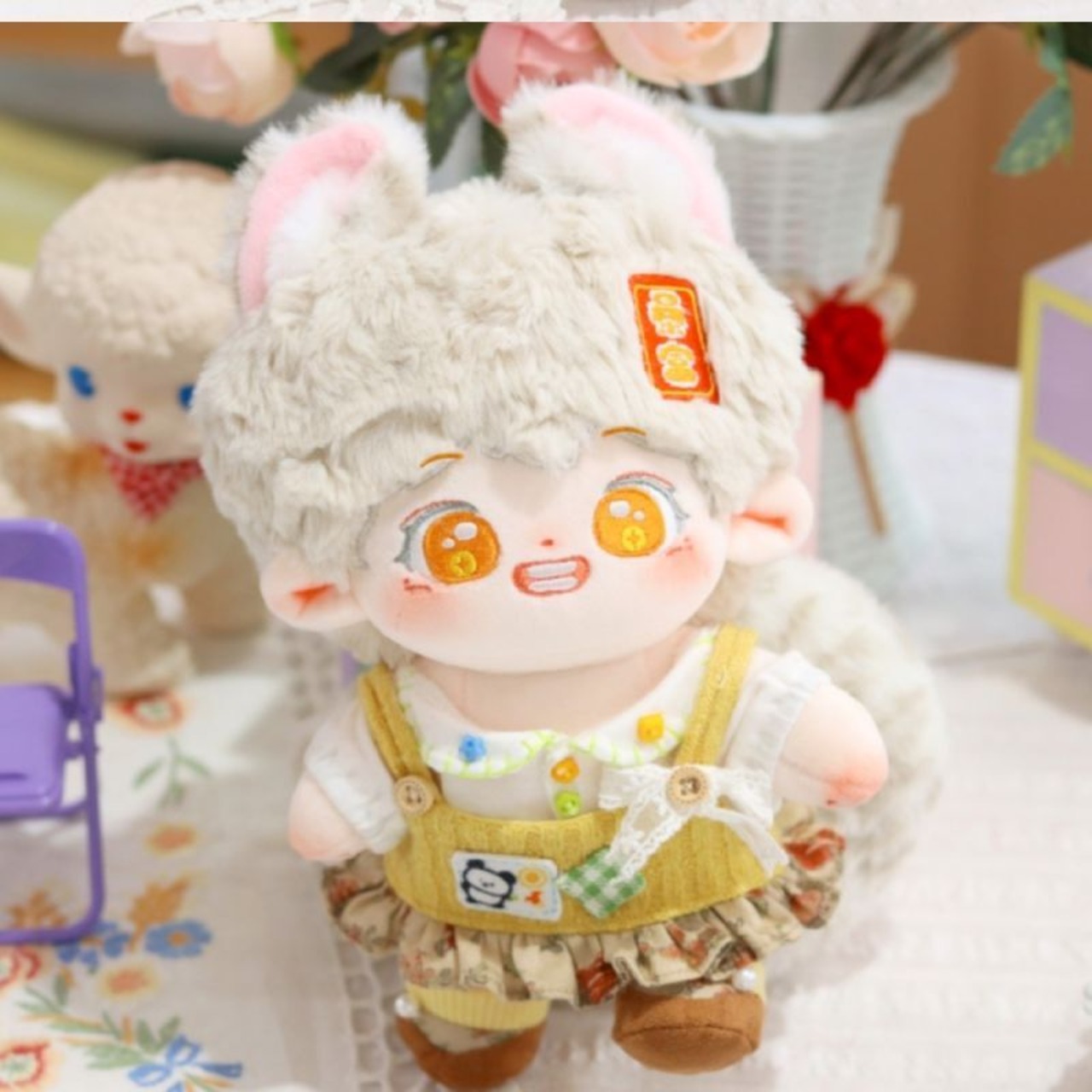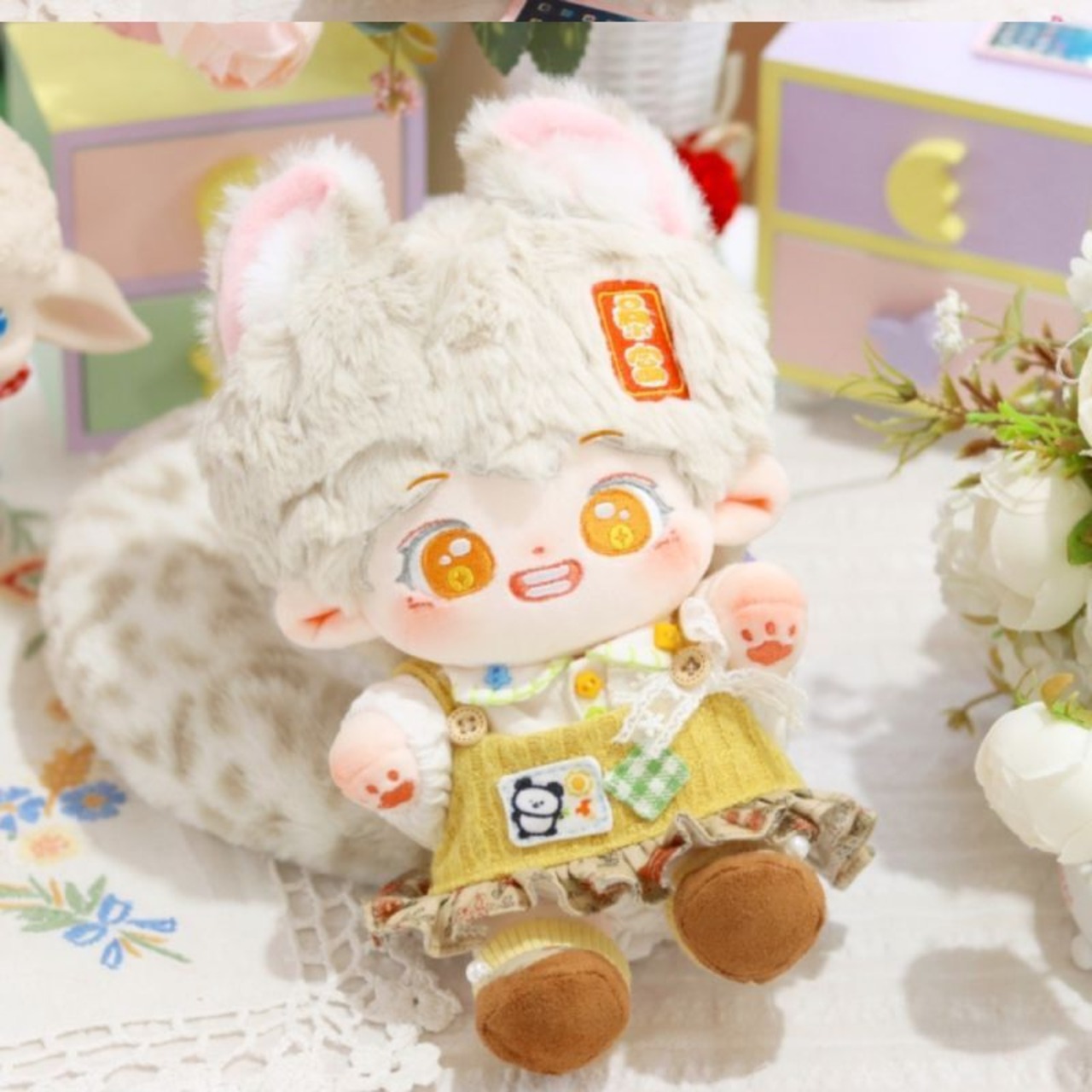 無属性 ぬいぐるみ 20cm 着せ替えぬいぐるみ 灰色の髪のオレンジ色の目獣耳付け男の子